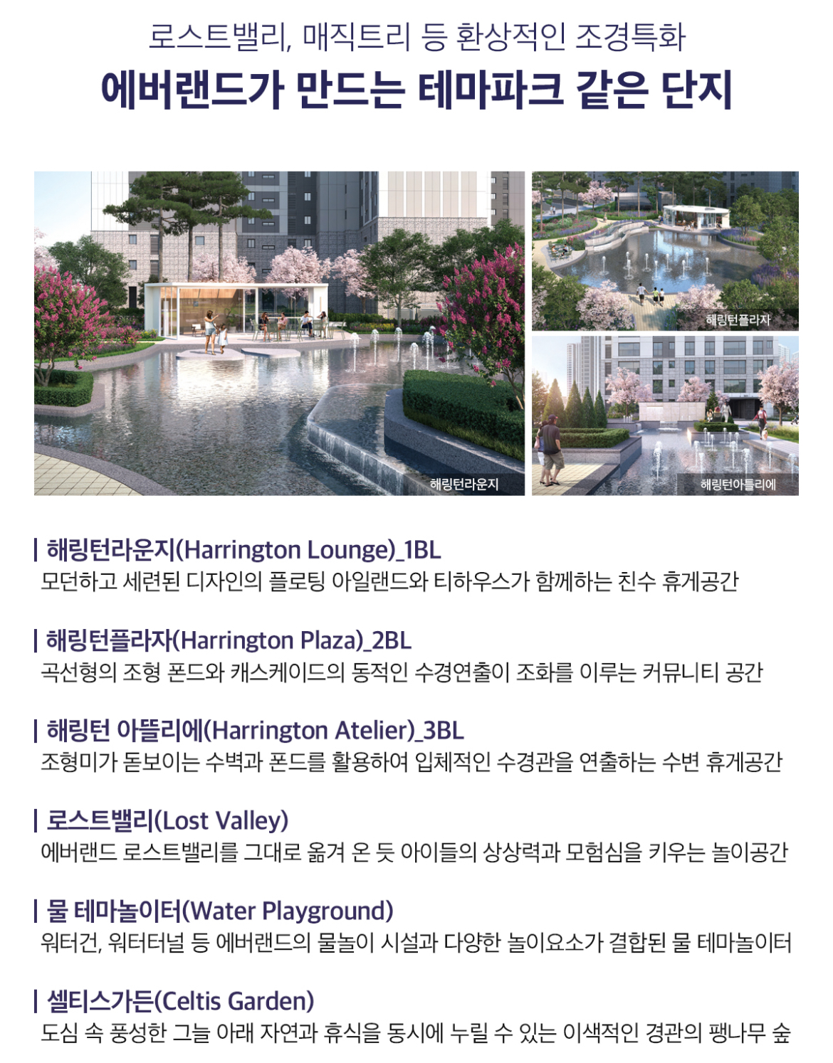 단지는 지하 3층에서 지상 29층까지 17개 동으로 설계되었으며 전용면적은 59제곱미터에서 84제곱미터까지 다양하게 공급된다. 시공과 시행은 효성중공업이 맡아 해링턴 플레이스 브랜드를 적용했다.