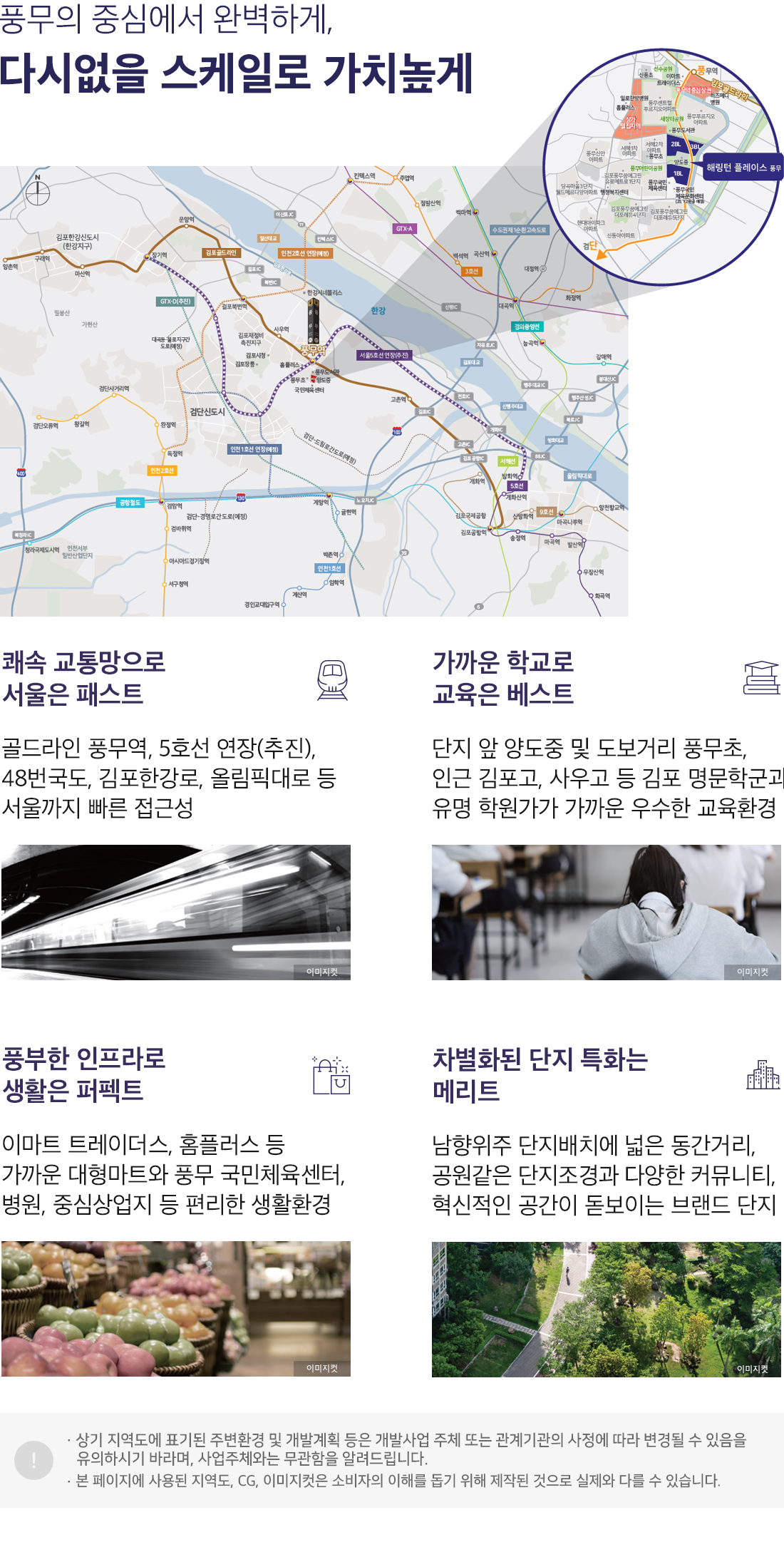 단지는 풍무동 일대 생활 편의시설과 교육환경 자연환경을 동시에 갖춘 것이 특징이다 풍무이마트와 롯데몰 김포공항 김포시청이 인접해 있으며 풍무초와 중고교가 도보권에 있어 교육환경이 우수하다 또한 장릉산 근린공원과 한강시민공원 등 자연환경이 가까워 쾌적한 주거 여건을 제공한다