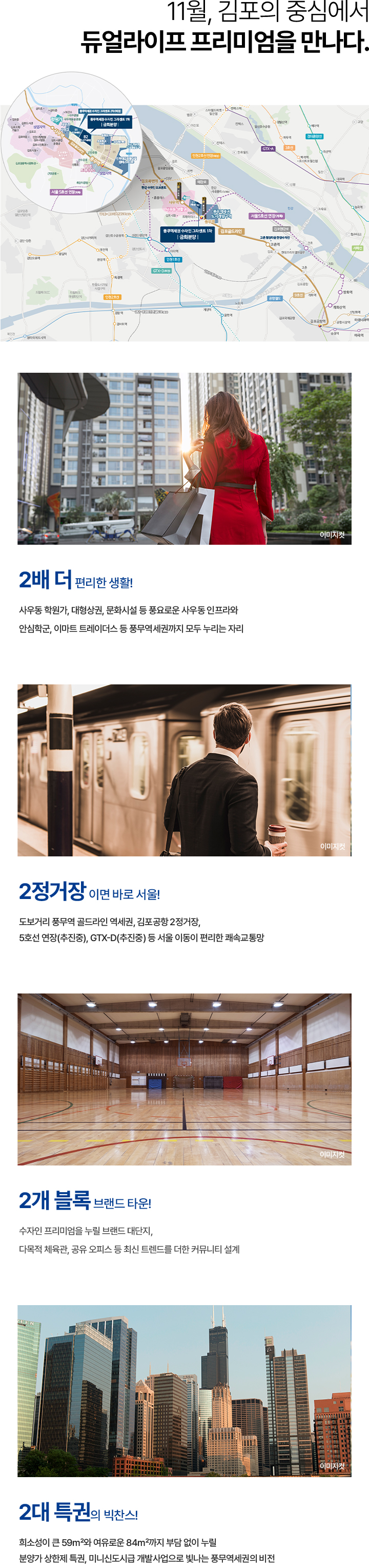 입지 여건은 특히 돋보인다. 김포 도시철도 구간을 통해 서울 주요 지역 접근성이 확보돼 있으며 풍무역 중심 생활권의 기반시설을 누릴 수 있다. 도로 교통망도 탄탄해 자차 이동이 편리하고 인근 풍무 생활권의 상업시설과 교육 시설이 가까워 가족 단위 수요자들의 관심이 집중되고 있다.