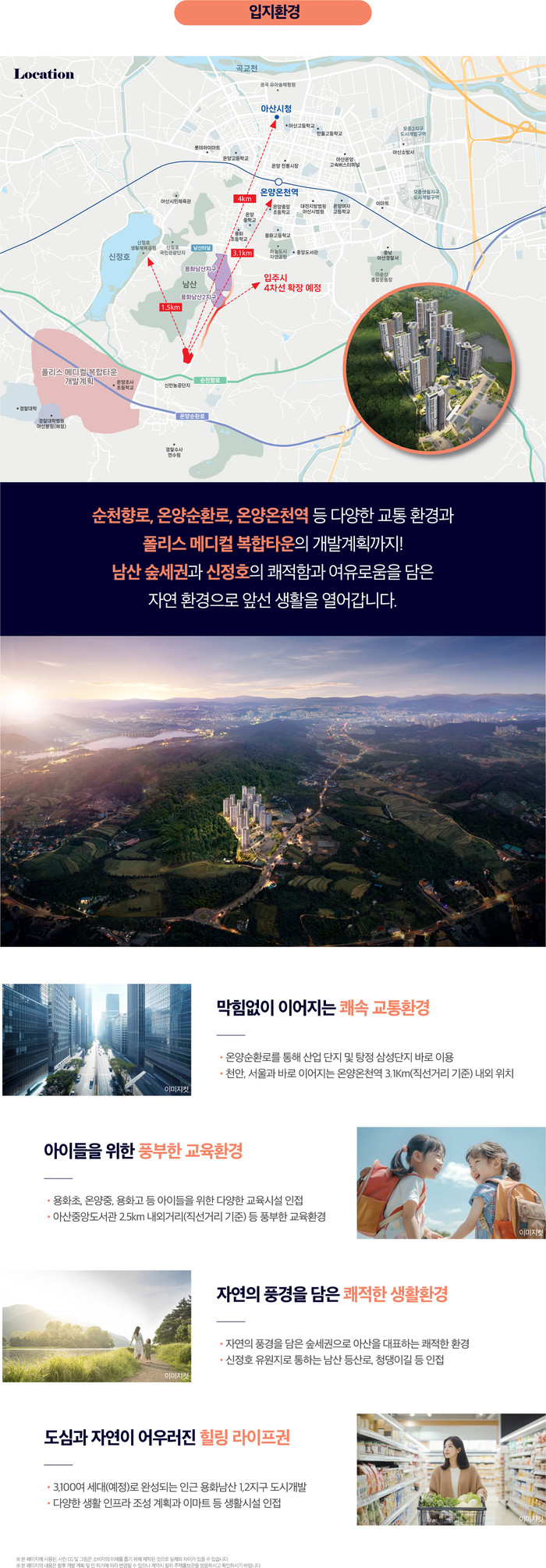교통 여건도 뛰어나다. 단지 인근에 천안아산역이 위치해 KTX와 SRT를 통한 수도권 접근이 용이하고 주변 고속도로와 주요 도로망을 이용하면 서울과 기타 광역지역으로 빠른 이동이 가능하다. 또한 대형마트와 백화점 관공서 병원 등 생활편의시설이 가까워 편리한 주거환경을 제공한다. 교육 여건 역시 우수해 초중고등학교가 단지 근처에 위치해 통학이 편리하다.