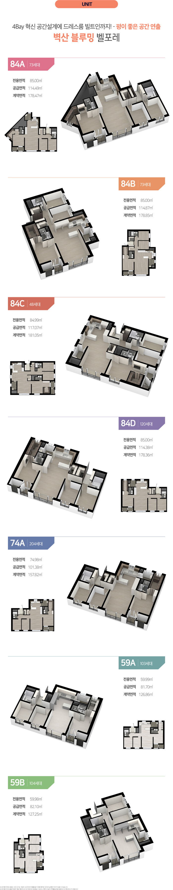 벽산블루밍 벨포레는 지하 두 층에서 지상 최고 29층 규모로 조성되며 총 세대수는 정확히 공개되지 않았으나 중소형 중심으로 구성되어 입주민 실거주 만족도를 높일 계획이다. 전용면적은 오십구제곱미터에서 팔십사제곱미터까지 다양하게 마련되어 실수요자의 선택 폭을 넓혔다.