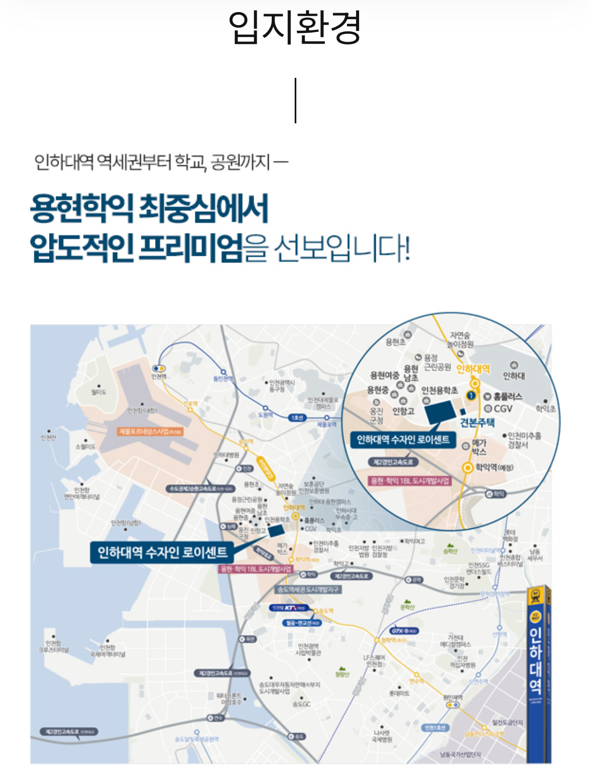 부동산 업계 관계자는 인하대역 수자인 로이센트는 교통 입지 생활 인프라 교육 환경까지 모두 충족하는 단지라며 실수요자는 물론 투자 목적의 수요자들에게도 충분한 가치가 있는 상품이라고 평가했다